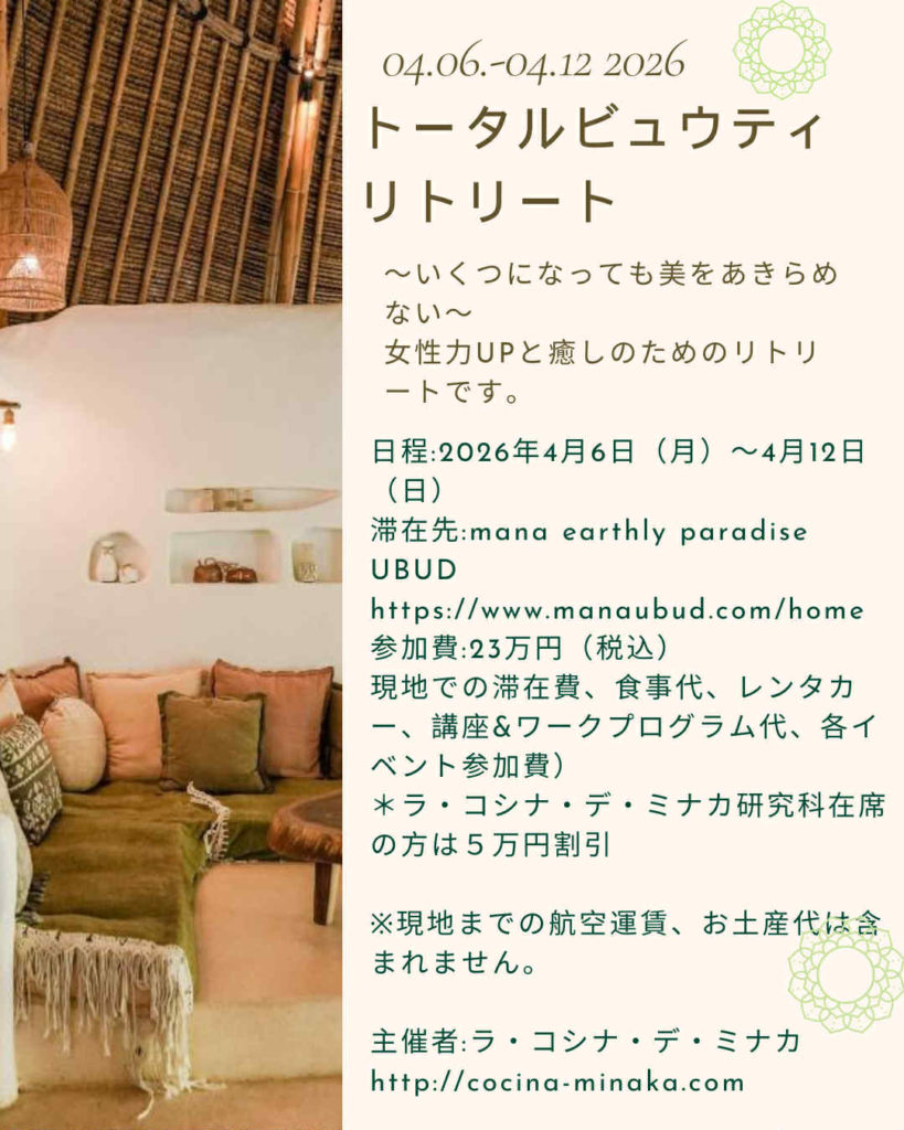 また、マクロビオティック総合講座を東京と山梨で行うラ・コシナ・デ・ミナカの永井邑なかによる、女の勘・直感を司る子宮で診る望診講座付き。自分の本質を知り、人間関係やパートナーとの関係性を豊かに円滑に人生を豊かにするヒントを得るお得なリトリートです。